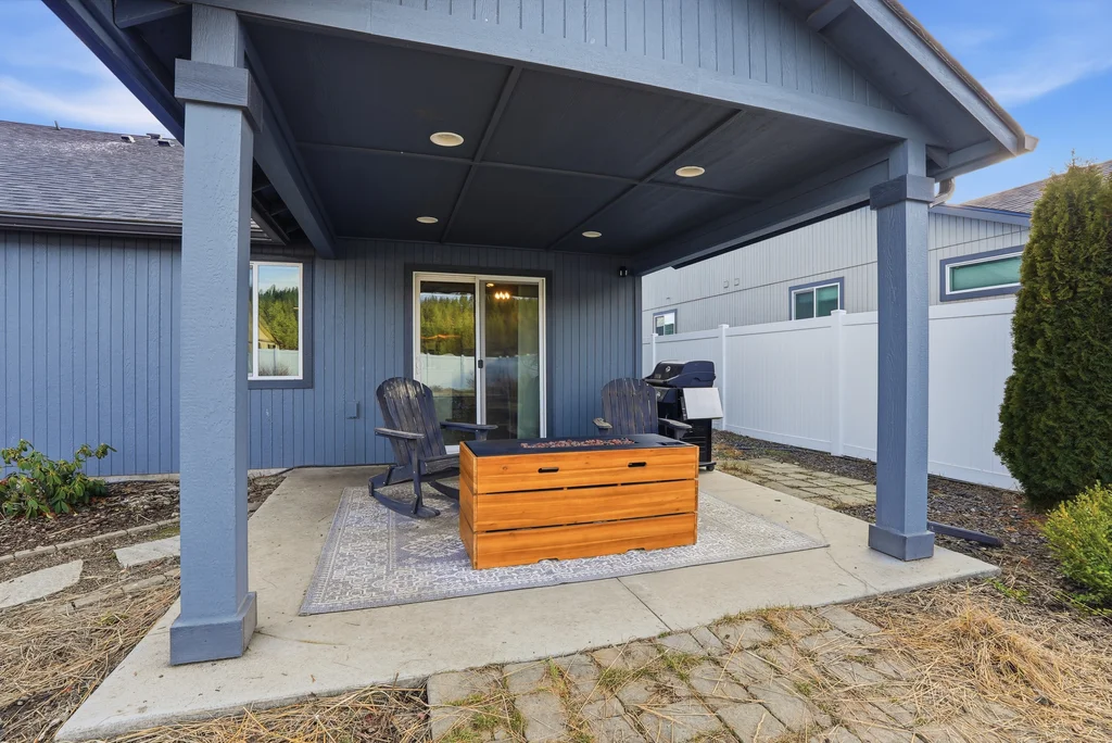 through the glass sliders to your private, fully fenced oasis. Whether you’re hosting a BBQ on the covered patio or soaking in the hot