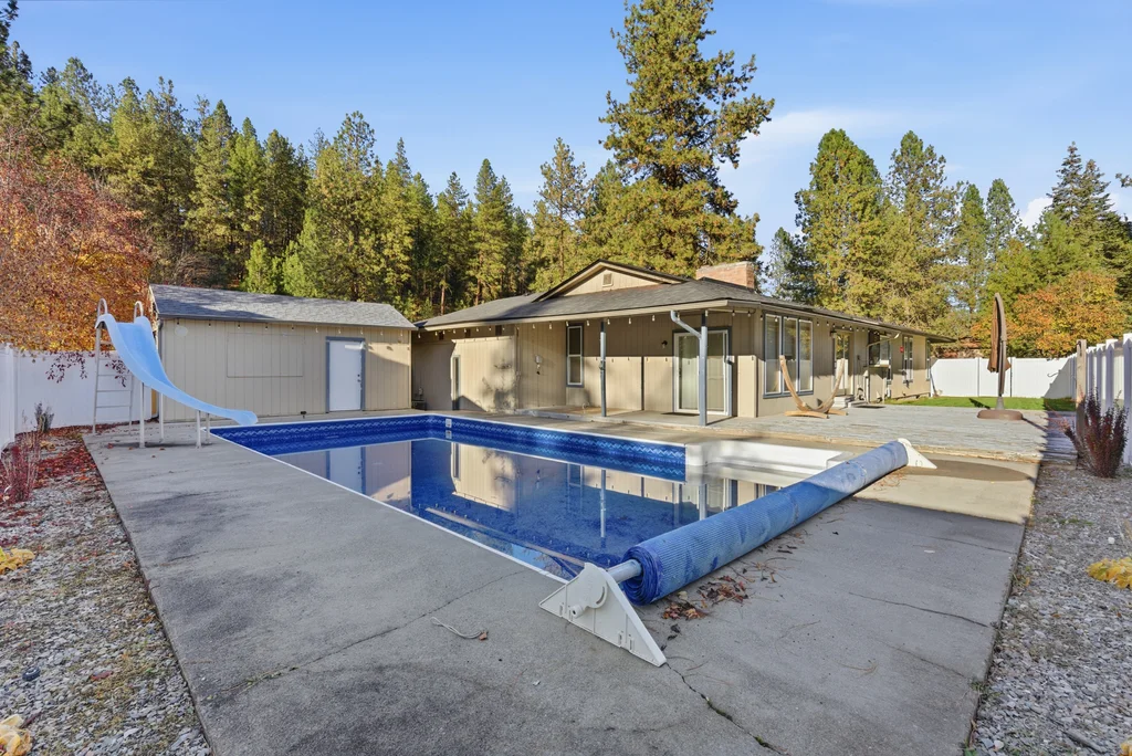 Brand new roof October 2025!! This stunning 5-bedroom, 3-bathroom rancher spans 3,200 sq. ft, a corner lot, and offers the perfect blend of privacy and convenience. Surrounded by swaying trees, this home is a true private oasis, ideal for both relaxation and entertainment. Step into the inviting open floor plan, featuring a spacious kitchen with an eat bar and breakfast nook—perfect for casual mornings or hosting gatherings. The main level boasts a cozy gas fireplace, convenient main-level laundry, and a primary en-suite for ultimate comfort. With two family rooms, there's plenty of space to unwind, while the backyard retreat is designed for fun and relaxation. Enjoy summer days by the inground pool, or entertain guests at the poolside bar and expansive patio—perfect for grilling and lounging. Additional highlights include RV/boat parking, a serene corner lot, and a prime location just minutes from shopping, restaurants, and the natural beauty of Pine River Park and the Little Spokane.