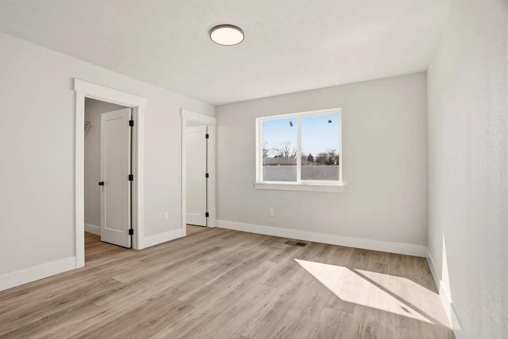 countertops, shaker cabinetry, and all stainless steel appliances—refrigerator included. The private primary suite serves as a restful