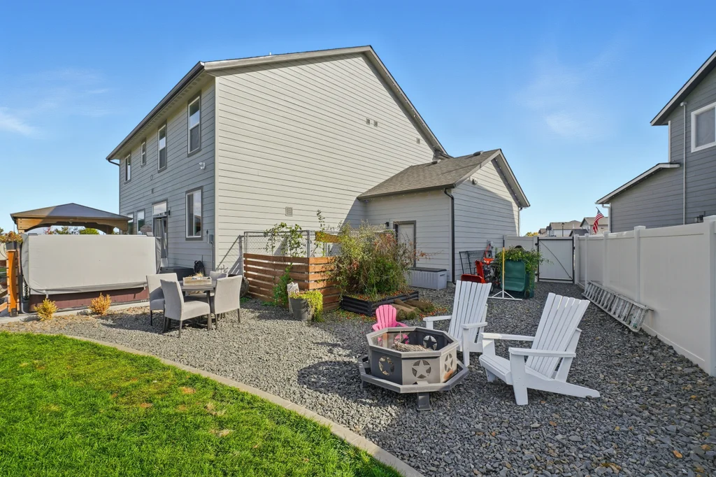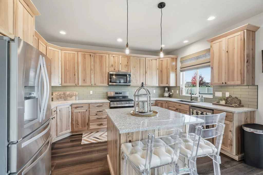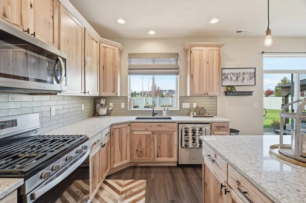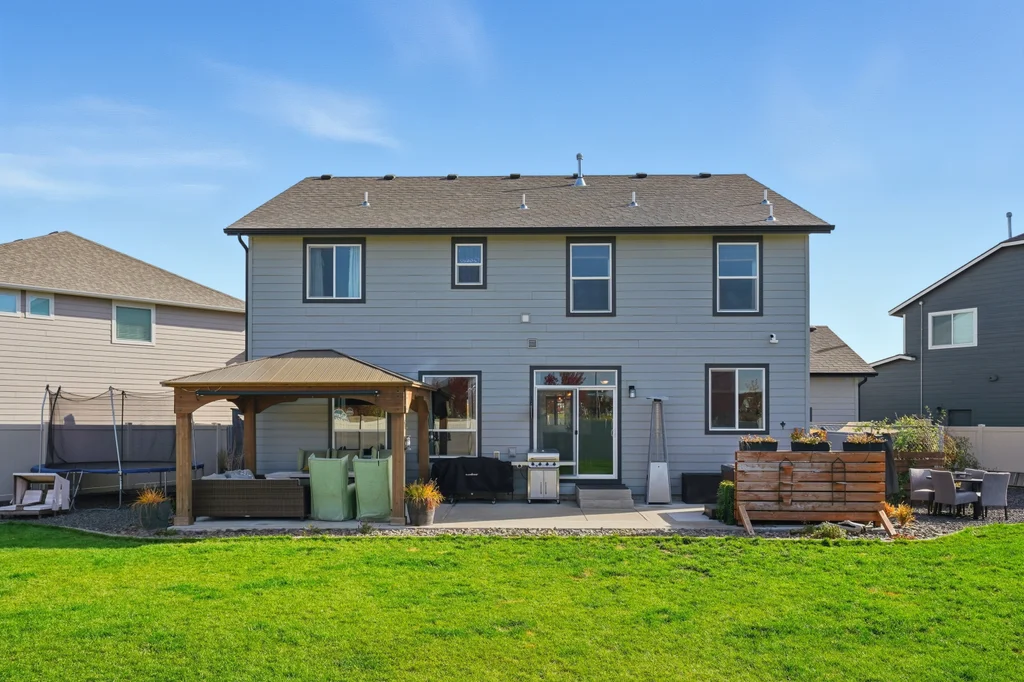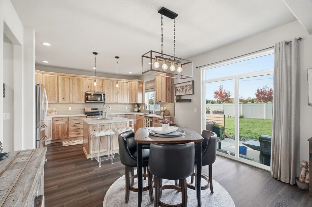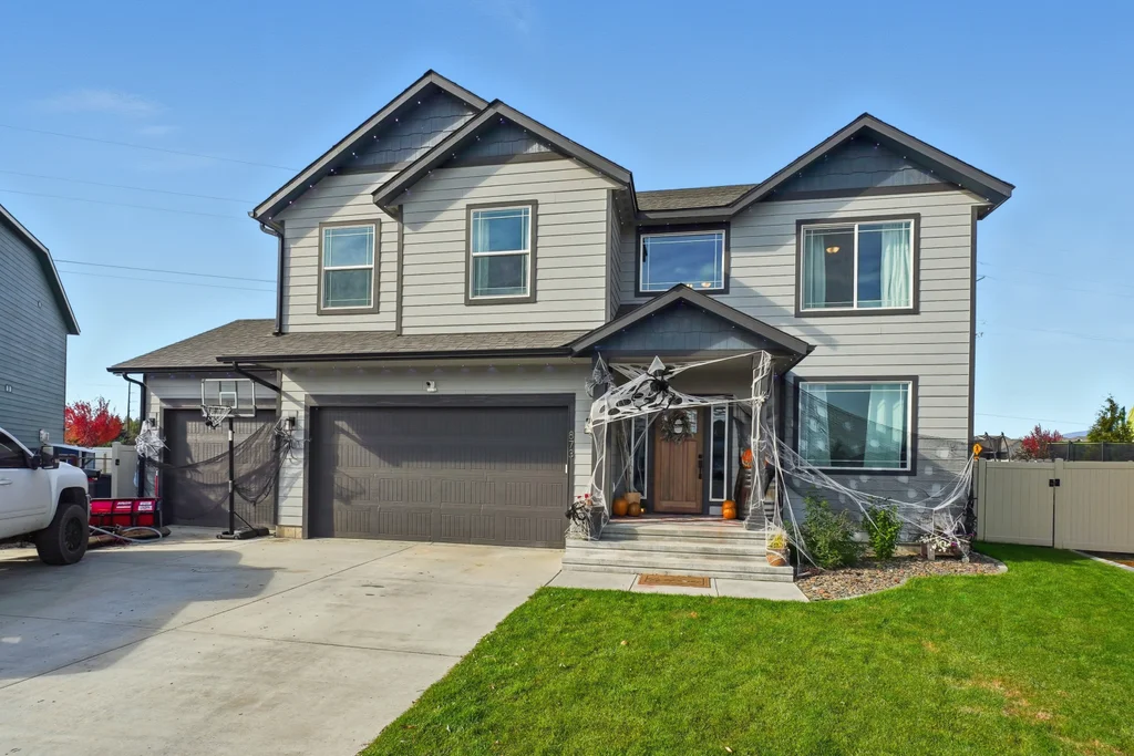 Step into this beautiful 2022 Parade of Homes design featuring a grand entry, open living and dining, and a kitchen made for connection—with quartz countertops, walk-in pantry, and warm hickory cabinets. The upstairs layout offers comfort and convenience with a large primary suite, walk-in closet, and laundry nearby. Enjoy upgrades throughout—AC, gas fireplace, premium lighting, and 8' garage doors. Outside, a fully fenced and landscaped yard offers space to play, unwind, and entertain. Nestled in North Place, a community with private parks and walking paths, this home perfectly blends modern comfort with small-town Post Falls charm.